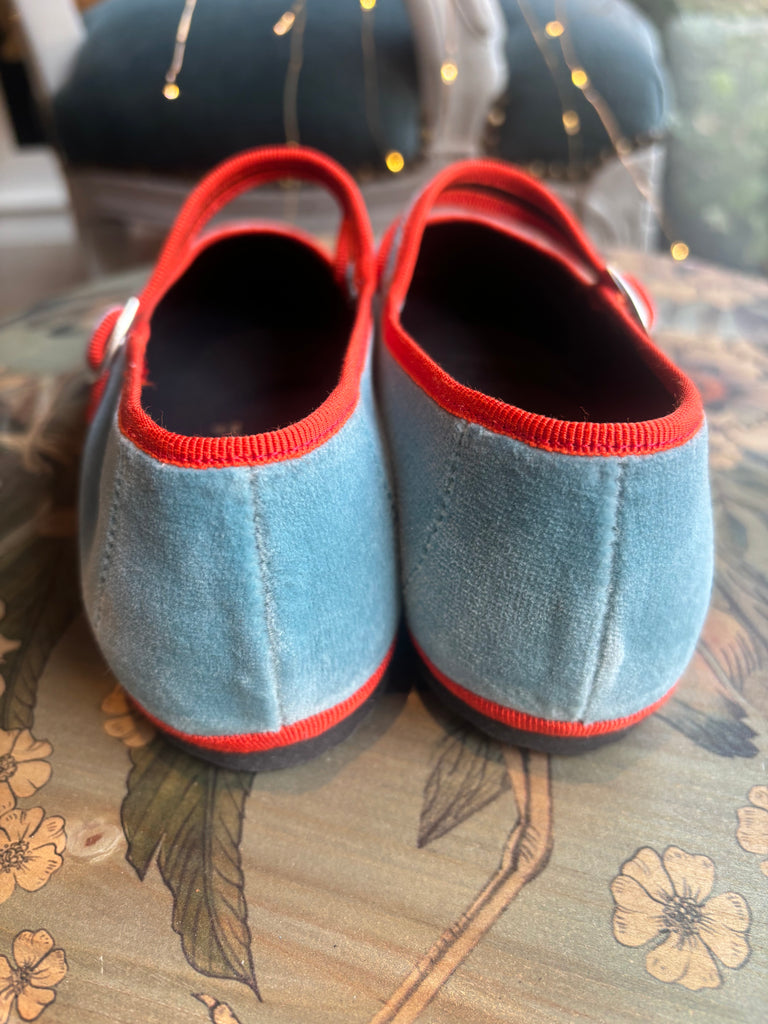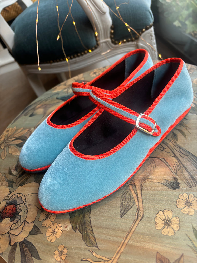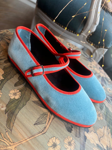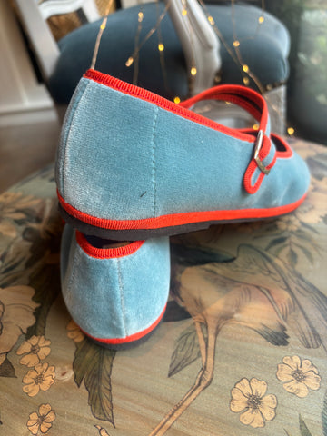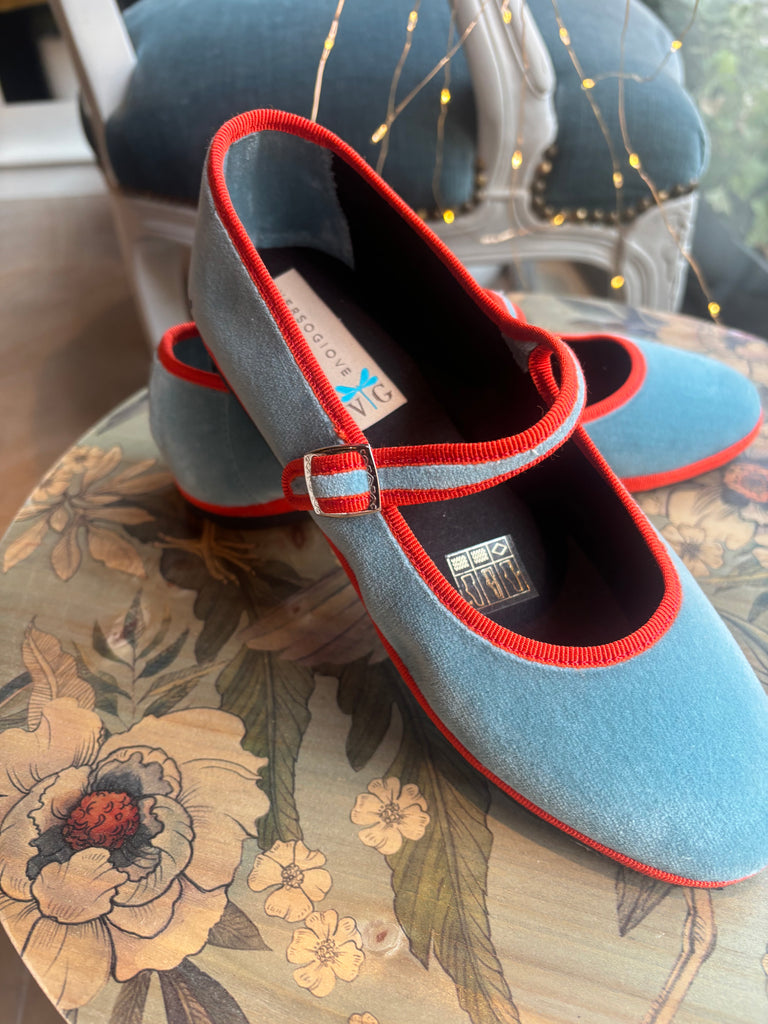 mary jane velluto azzurro con bordatura arancione
